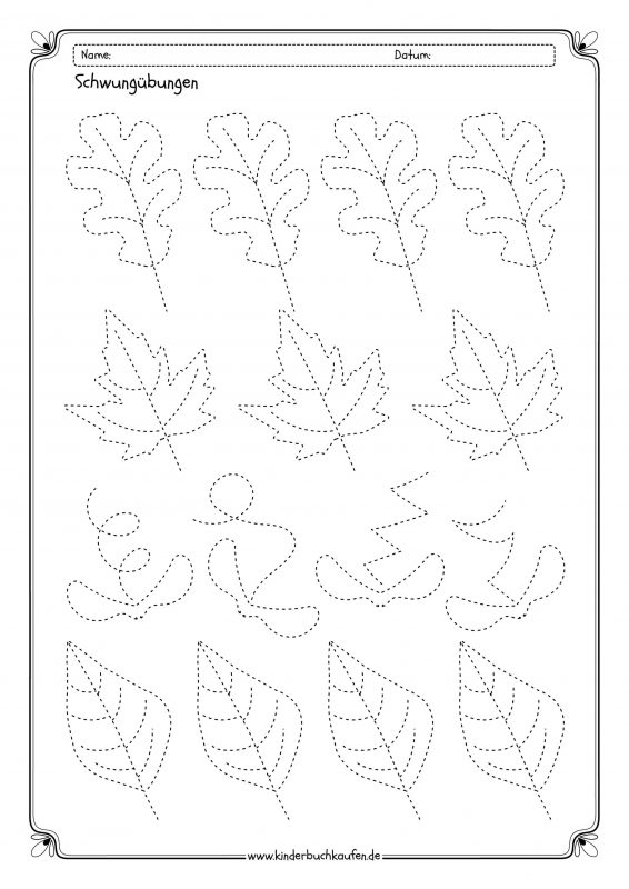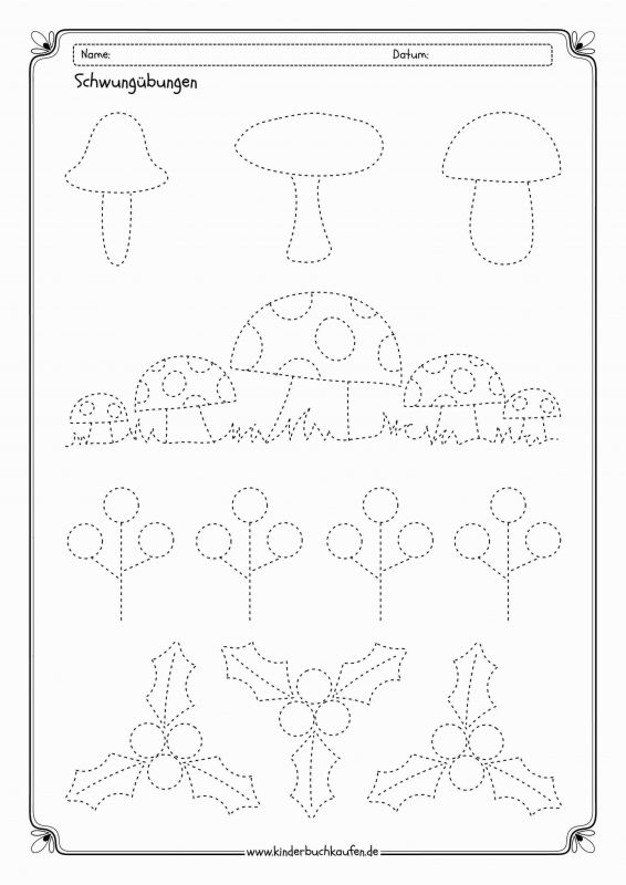 Viele Kinder halten sich sehr gerne in der Natur auf, entdecken ihre Umwelt mit schier unerschöpflicher Neugier und können sich für Pflanzen aller Art begeistern. Mit Arbeitsblätter Schwungübungen, die Motive aus der Natur aufgreifen, lässt sich dieses Interesse harmonisch mit dem Lernen verbinden. Arbeitsblätter mit Schwungübungen Natur laden zum Nachspuren der natürlichen Formen von Blättern, Blumen, Pilzen und Co. ein und führen Kinder auf diese Weise zum Beispiel spielerisch an das Zeichnen von geschwungenen und gezackten Linien sowie das Nachfahren erster geometrischer Formen heran.